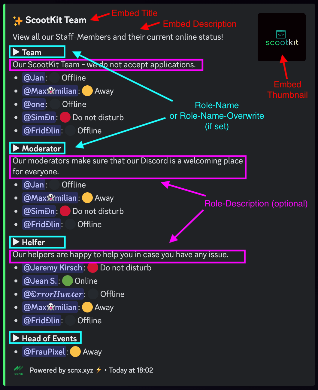 List all your staff and explain team-roles in an always-up-to-date embed.